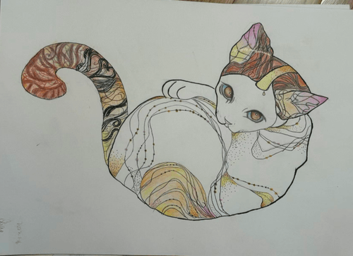 Curled cat in line + color pencils. Clean contours, patterned pockets of color, and a tail that spirals like stone.