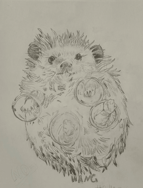 Pencil on paper. A palm-sized hedgehog rendered in airy lines and hush-soft shadows.