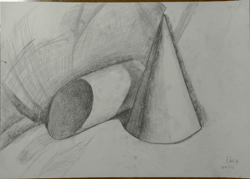 Graphite still life of a cone and cylinder on drapery. Soft gradations turn simple forms luminous—ellipses, planes, and shadow speaking in quiet greys.